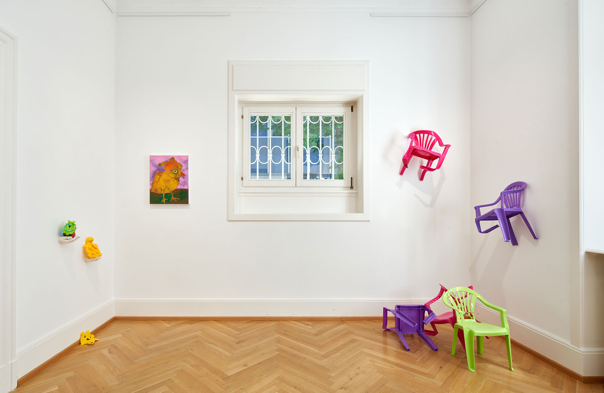 Elhassan's sculptures offer a thought-provoking commentary on the nature of children's games. A pile of melted plastic water guns on a lego pedastal serves as a metaphor for the parallels between war and plastic - both harmful yet chosen and financed by society. Another sculpture features destroyed plastic children's chairs, alluding to the popular game of musical chairs and questioning the competitive, often violent narratives embedded in children's play.